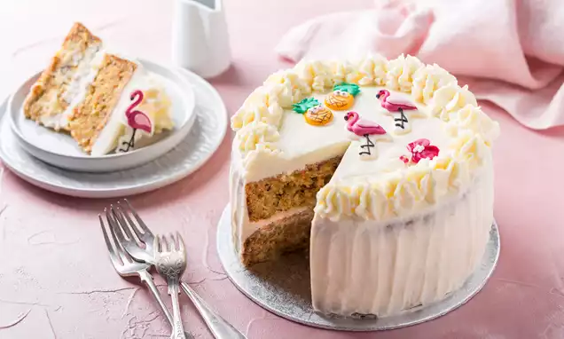 Mit etwas Fondant den länglichen, tropfenförmigen Kopf formen. Am schmaleren Ende gut 2 cm tief einschneiden, Ohren formen und etwas auseinanderdrücken. Mit einem Messerrücken Ohrmuscheln eindrücken. Augen mit Zuckerschriften aufzeichnen. Zähne ankleben und eine kleine Kugel für die Nase über den Zähnen befestigen. Ein kleines Stück Fondant zu einer 5 cm langen Rolle formen. Diese zuerst auf dem Cake befestigen. Den Kopf mittig auf der Rolle andrücken und befestigen. Diagonal das Hinterteil befestigen. Mit den Rüebli beliebig dekorieren.