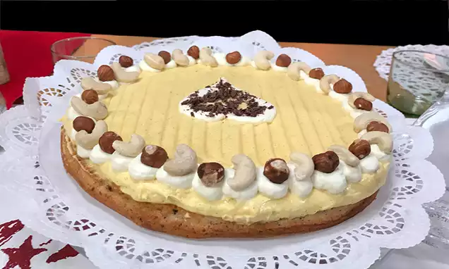 Den ersten Boden mit ¾ der Crème bestreichen. Den zweiten Boden darauflegen und leicht andrücken. Mit der restlichen Crème die Torte inkl. Rand bestreichen.