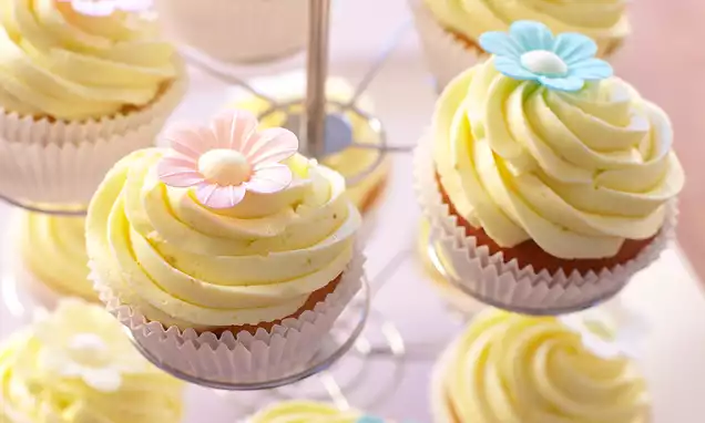 Mélanger les ingrédients et répartir sur les muffins refroidis à l’aide d’une poche à douille avec un embout rond de taille moyenne. Saupoudrer les cupcakes de cacao et décorer avec les Rouleaux zébrés au chocolat.