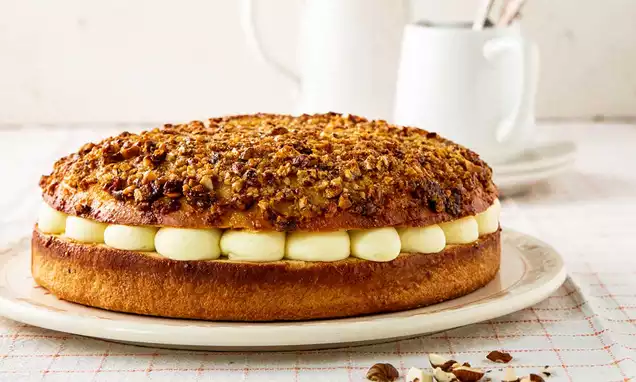 Togliere dal forno e lasciare raffreddare. Tagliare ciascun disco orizzontalmente in due parti e ricavare da due dischi un cerchio centrale (ca. 9 cm Ø). Posizionare uno dei due dischi interi su un piatto per torte.